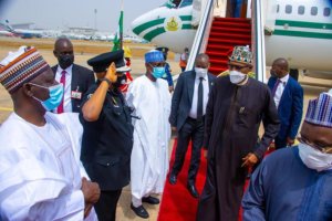 President Muhammadu Buhari on Monday returned to Abuja after a four-day official visit to Addis Ababa, the Ethiopian capital, where he participated in the 35th Ordinary Session of Assembly of the African Union (AU).